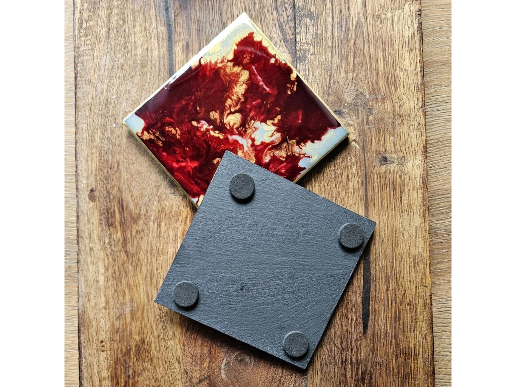 Břidlicový podtácek je zalitý křišťálovou pryskyřicí, alkoholové barvy, zlatý prach.